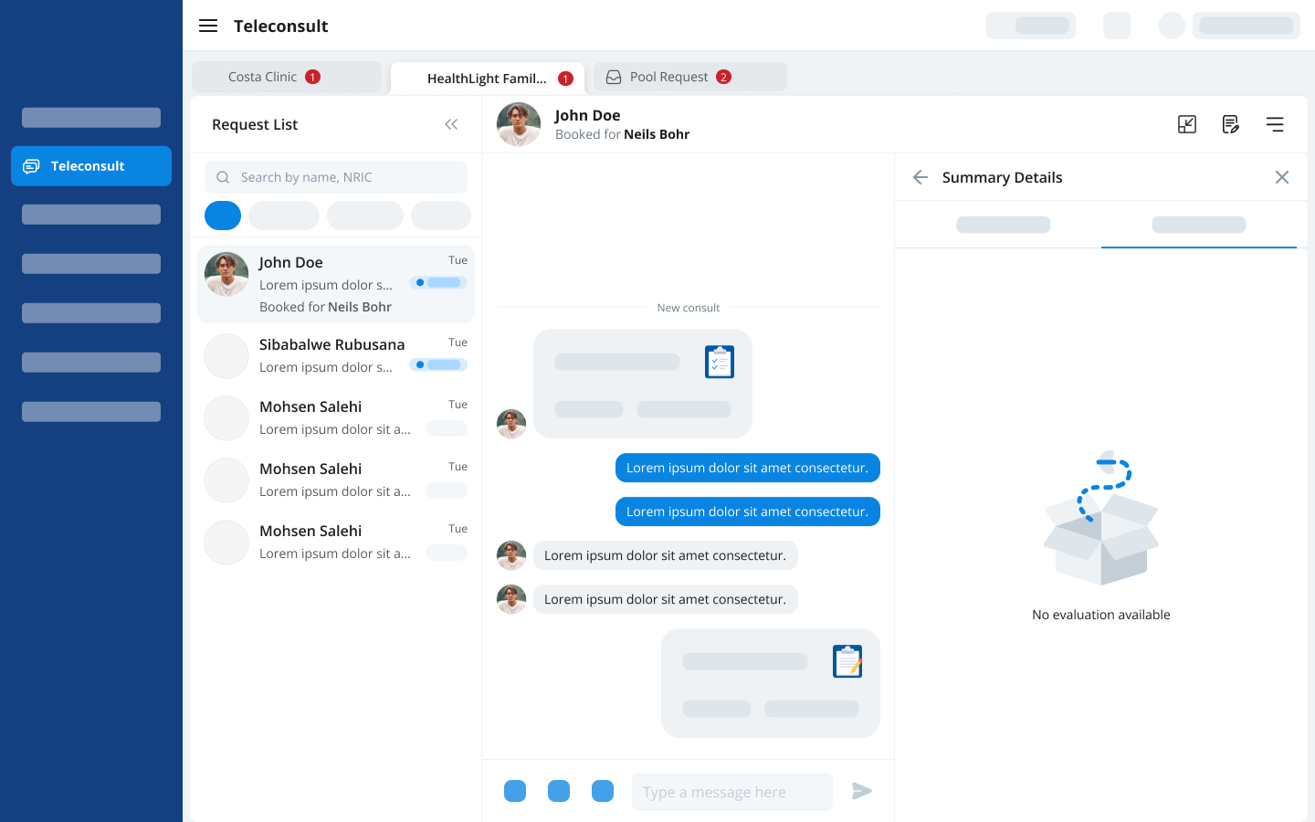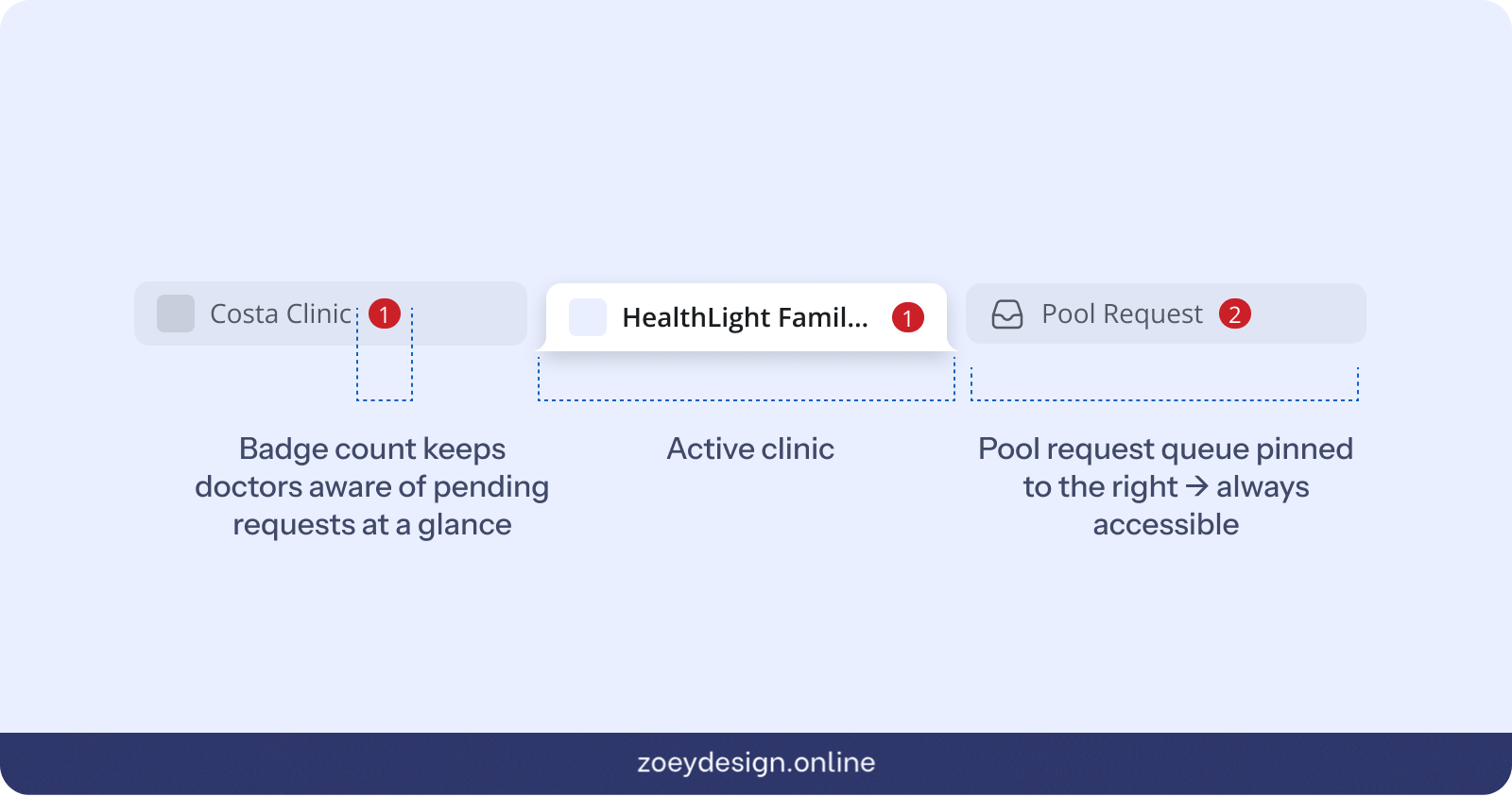 The pool consultation queue presented a separate problem. Unlike clinic tabs, it is not tied to any single clinic context. A doctor needs to be able to see and act on pool requests regardless of which clinic tab they are currently in. I anchored the pool queue as a pinned tab on the right side of the tab bar, visually separated from the clinic tabs. This gave doctors persistent access to the pool queue at all times without interrupting their active clinic context. It also reinforced an important conceptual distinction: direct consultations belong to a clinic, pool requests belong to no clinic in particular.