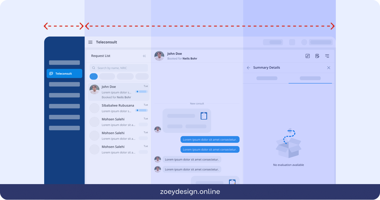 Knowing the mental model pointed me toward a horizontal switching pattern, but the layout constraint confirmed it. Doctors frequently split their screen or minimise the Doctor DB tab to reference other tools mid-consultation. Any navigation that consumed vertical space would shrink the workspace they depended on. A sidebar or vertical menu was ruled out entirely. A horizontal contextual tab switcher at the top of the teleconsult view kept the full workspace intact below it.